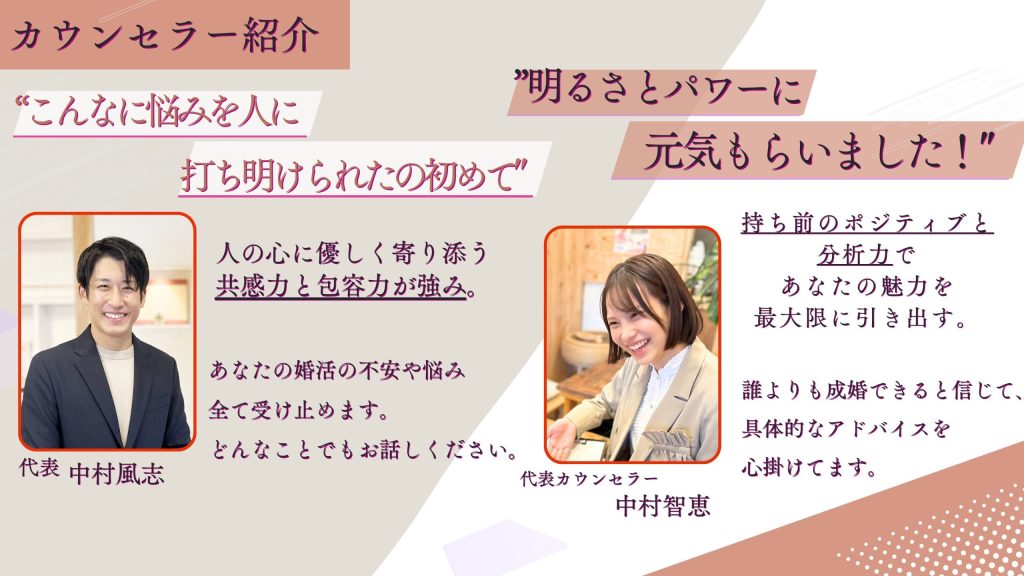 恋愛はあきらめない。だけど、その先にある“結婚して幸せな人生を歩める相手”と出会ってほしい。そんな想いで、開業し一人でも多くの方のご縁をサポートしています。